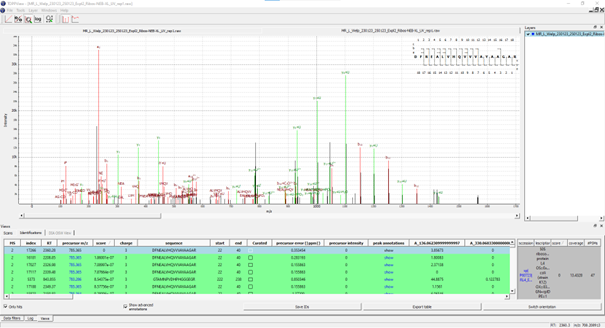 - Assess features such as peptide sequence coverage and the presence of key ions.